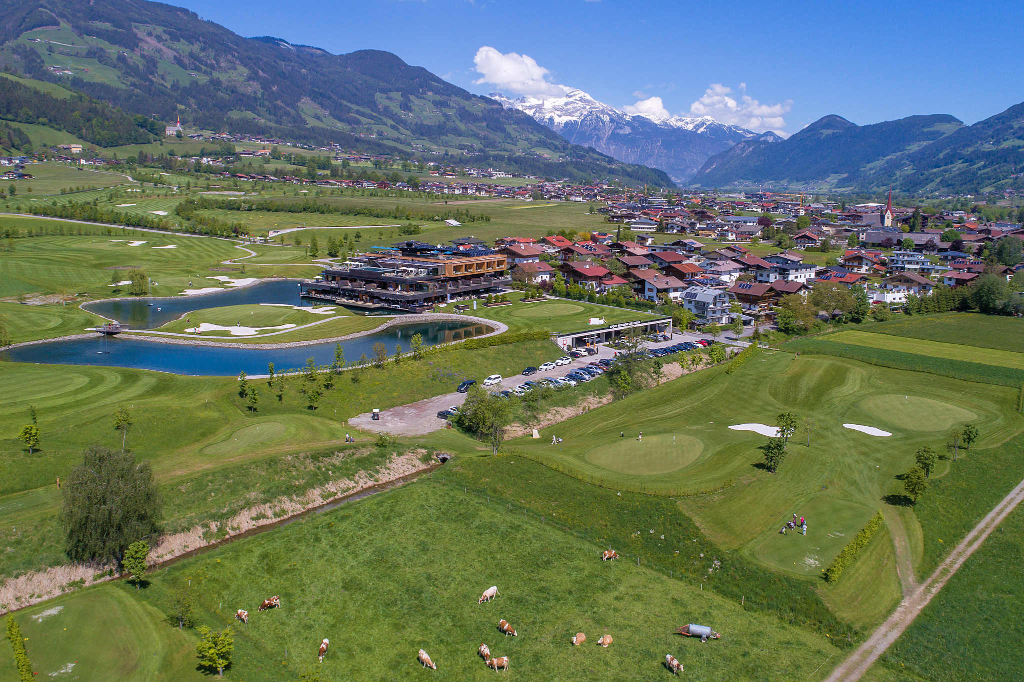 Genießen Sie Ihre Golfrunde inmitten der imposanten Bergwelt des Nationalpark Hohe Tauern in einem komplett flachen und einfach begehbaren Gelände. Ohne Stress & Hektik geht es von Green zu Green – vorbei an urigen Heustadeln, begleitet von einem kleinen Bach welcher in einem wunderschönen Par 3 Inselgrün direkt vor der Clubhausterrasse endet.
